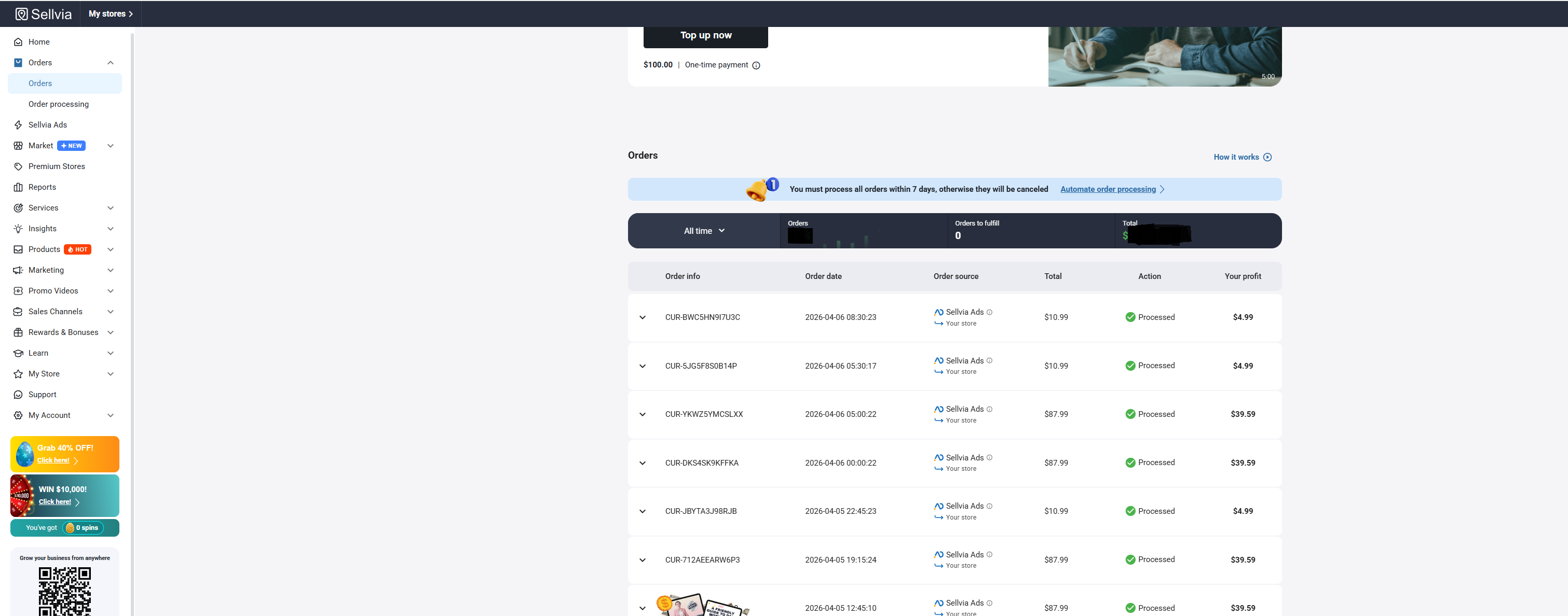 If your Sellvia balance is empty when an order comes in the order won’t process automatically. You’ll see it in your dashboard as awaiting processing. You can add funds manually and then process it - but there’s a window before the order times out. Fund your balance before you launch. Not after. $50-100 sitting in your Sellvia balance ensures every order processes automatically without you needing to react in real time.