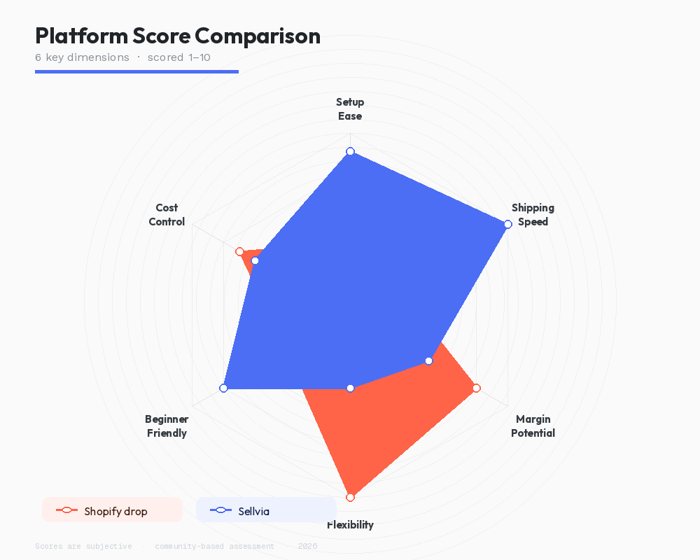 Setting it out plainly: Sellvia wins on setup speed, shipping experience, and beginner accessibility. Shopify dropshipping wins on flexibility, margin ceiling, and long-term scalability. They’re roughly equivalent on monthly cost when you account for everything. The learning curve is steeper on Shopify but the knowledge you build is more transferable.